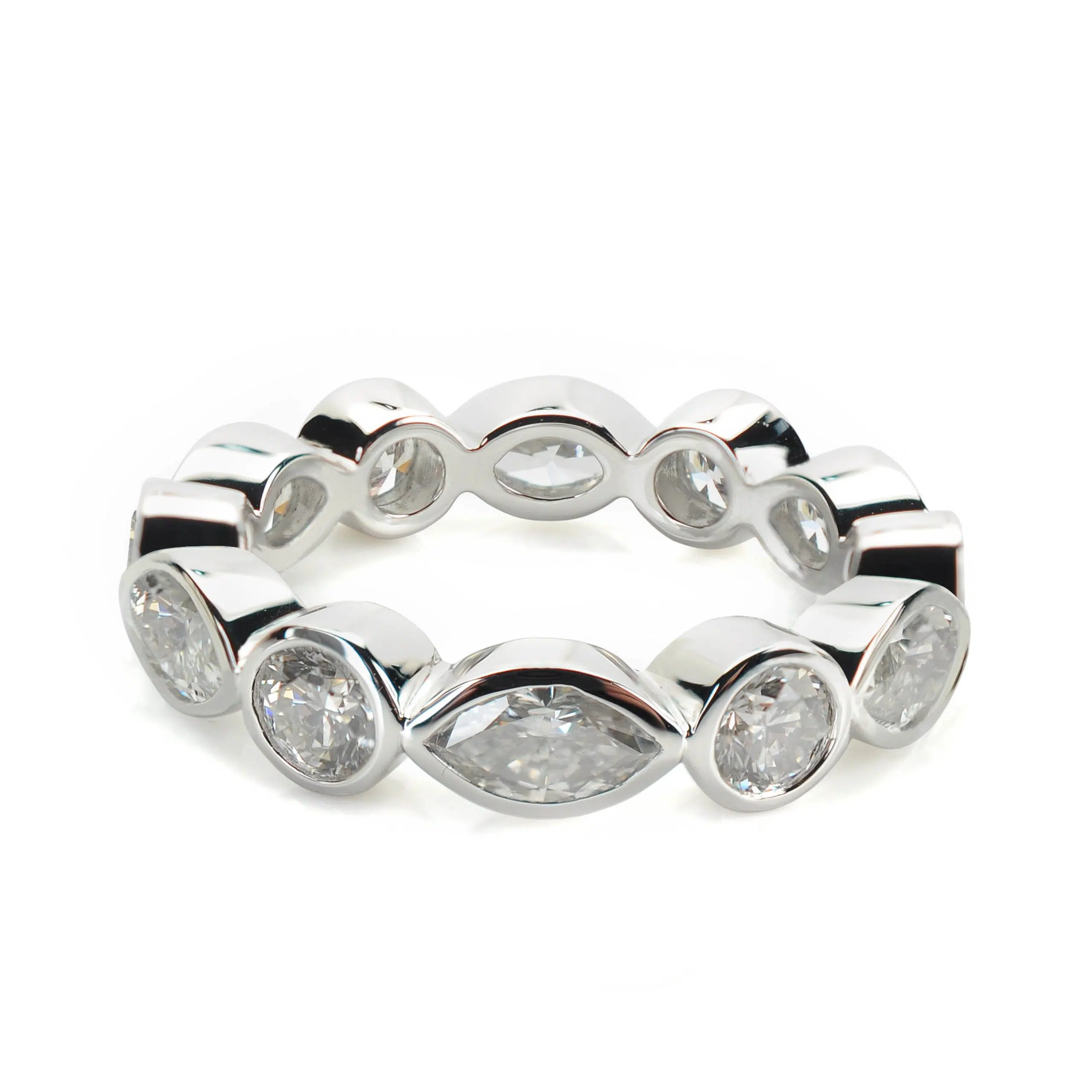 Discover timeless elegance with the CROSS ROADS Platinum Diamond Ring, a versatile piece perfect as a dress ring, wedding band, or eternity ring. Expertly crafted in premium platinum, this sophisticated design features a striking alternating pattern of six bezel-set round brilliant cut diamonds and six marquise cut diamonds. The unique mix of diamond shapes creates a modern yet classic look, making it a meaningful and stylish choice for any occasion.