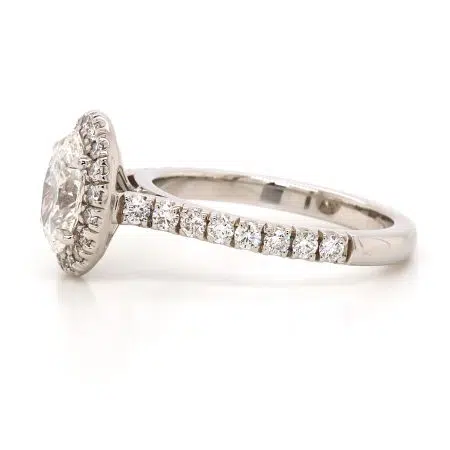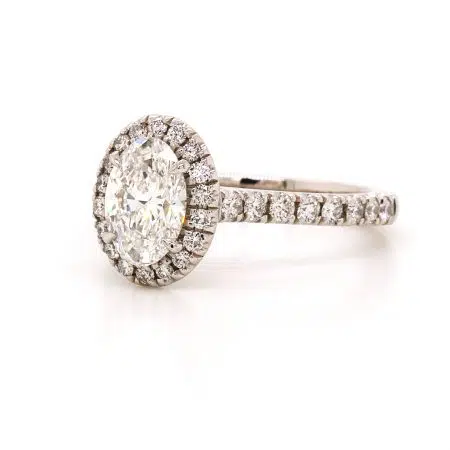 A beautifully handcrafted 18ct white gold engagement ring, KIRSTY features a striking oval lab-grown diamond at its centre, elegantly secured with four claws. Enhancing its brilliance, the centre stone is framed by a delicate halo of 18 natural round brilliant cut diamonds, adding timeless sparkle and depth. The shoulders are gracefully adorned with 8 additional natural round brilliant diamonds on each side, creating a seamless flow of light and luxury.