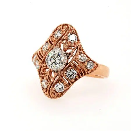 Timeless and elegant, the LIBBY ring is a stunning example of Art Deco design in luxurious platinum. At its center, a bezel-set round brilliant-cut diamond catches the light beautifully, surrounded by ten smaller round diamonds claw-set throughout the intricate filigree design. Finished with delicate milgrain detailing, this vintage-style ring adds a refined sparkle to any look. Whether you’re dressing up for everyday elegance, a formal function, or a cocktail party, LIBBY is the perfect statement piece.