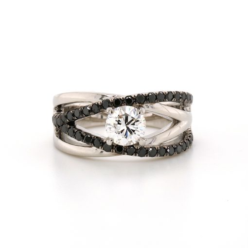 Platinum dress ring featuring a certified round brilliant-cut white diamond in a four-claw center setting. Two intersecting bands are claw-set with forty round brilliant-cut black diamonds, paired with two plain, highly polished bands. This exquisite piece is a testament to outstanding craftsmanship and premium quality, expertly designed and handcrafted in our Sydney workshop.