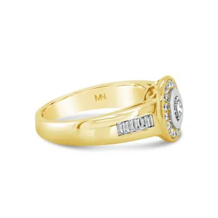 The MNJ Ladies Collection showcases Mark Nathan’s signature elegance and craftsmanship. The Miriam diamond engagement ring features a stunning 1.60ct round brilliant cut centre diamond, perfectly complemented by two 0.40ct round diamonds on each side. All three stones are set in a sleek and modern semi-bezel setting, offering a timeless and sophisticated look. Handcrafted to perfection.