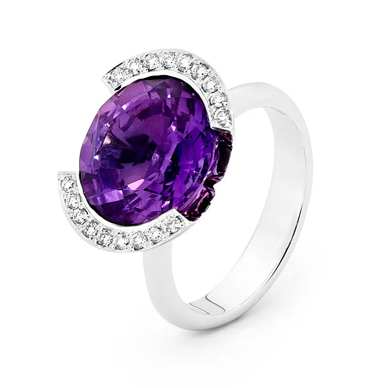 Turn heads with the SASHA ring, crafted in 18ct white gold. Featuring a deep purple oval amethyst in a semi-bezel silhouette setting, surrounded by 18 sparkling round brilliant cut diamonds. A stunning cocktail ring perfect for everyday elegance or special occasions.