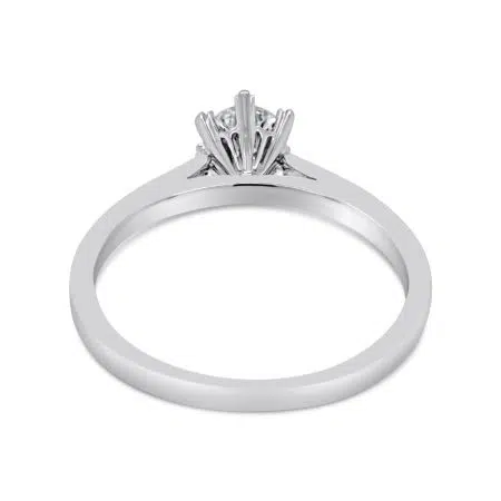 The elegant Snowflake diamond solitaire engagement ring features a round brilliant cut diamond set in a six-claw coronet setting, with each claw split into three delicate beads to create a snowflake-inspired design. Finished with a narrow band and graceful swept-up shoulders for a refined, timeless look.